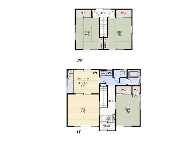 | 詳細間取 | 4DK (1階:洋8帖×1、1階:和6帖×1、2階:和6帖×2、1階:DK4帖) | ||